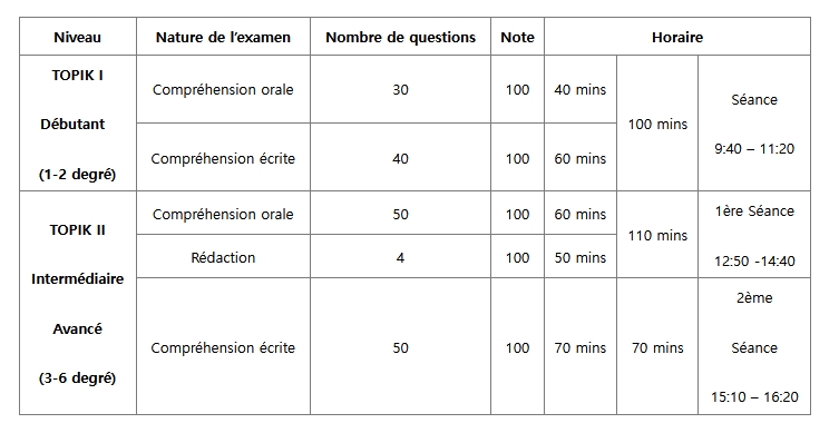 L'accès à la salle d'examen ne sera plus autorisé après 09h10 pour le TOPIK I et 12h20 pour le TOPIK II.